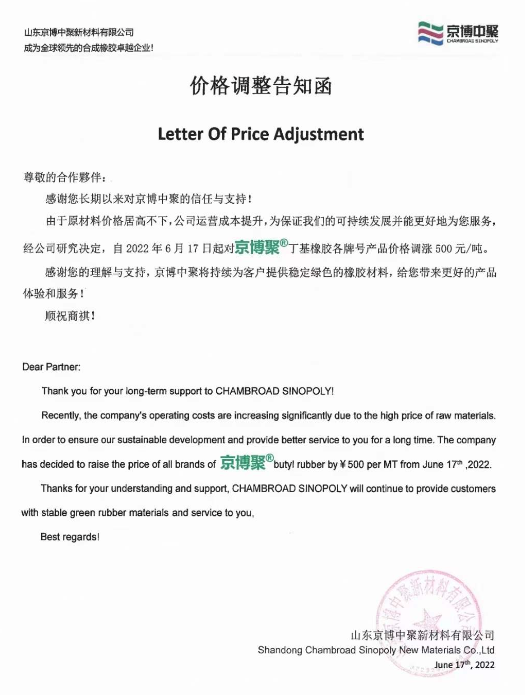 《中國(guó)橡膠》雜志從中了解到,自當(dāng)日起,該公司“京博聚”品牌丁基橡膠各牌號(hào)產(chǎn)品價(jià)格,上漲500元/噸。京博中聚表示,此次漲價(jià)的原因,是由于原材料價(jià)格居高不下,企業(yè)運(yùn)營(yíng)成本提升。
